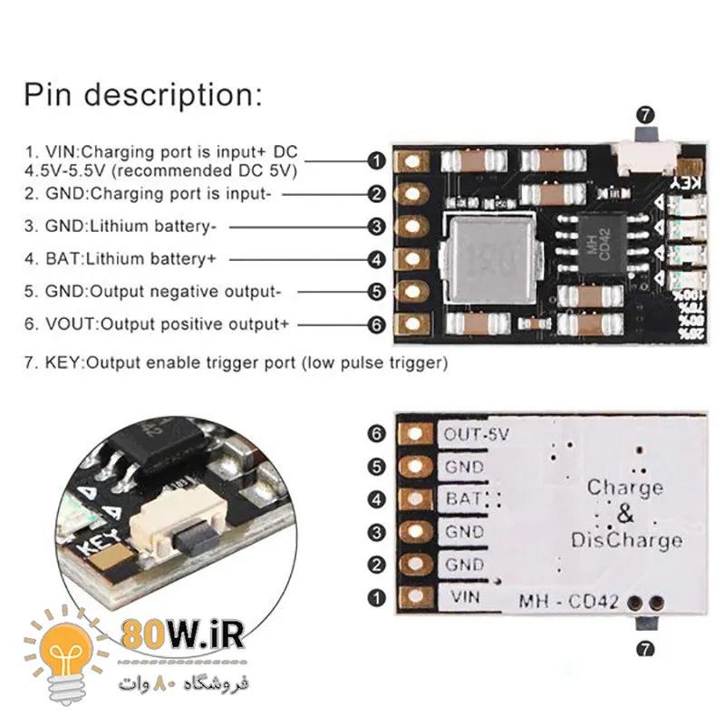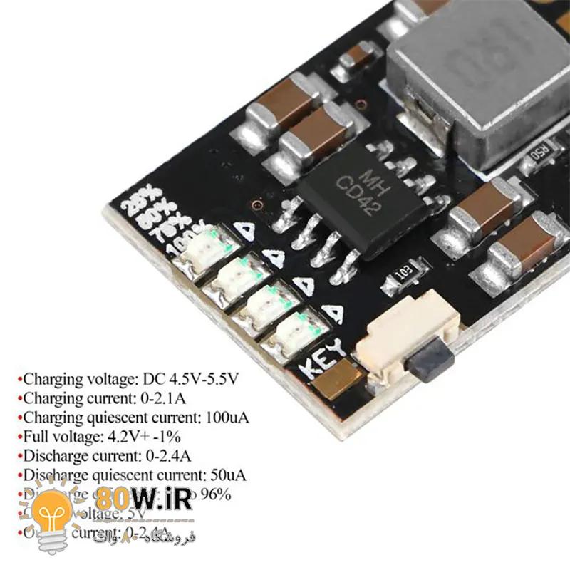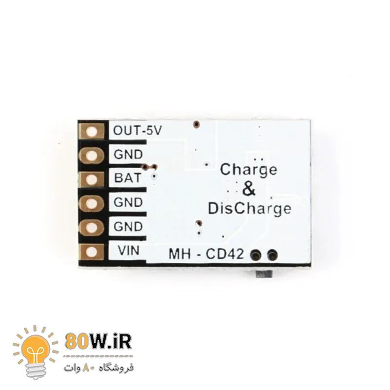 ماژول شارژر باتری لیتیومی MH-CD42 یک ماژول کاربردی است که برای شارژ باتریهای لیتیومی استفاده میشود. این ماژول قابلیت شارژ باتریهای لیتیوم پلیمری و لیتیوم یونی مانند باتریهای 18650 را داراست. با استفاده از شارژرهای تلفن همراه یا منبع تغذیه با ولتاژ 5 ولت، میتوانید باتری را به راحتی شارژ کنید. با اتصال باتری به پایههای BAT و GND- این ماژول، باتری خود را به طریقی ساده شارژ کنید. همچنین، این ماژول شارژر دارای یک پورت خروجی است که با استفاده از یک کلید، مسیر ورودی تغذیه را به خروجی متصل میکند.