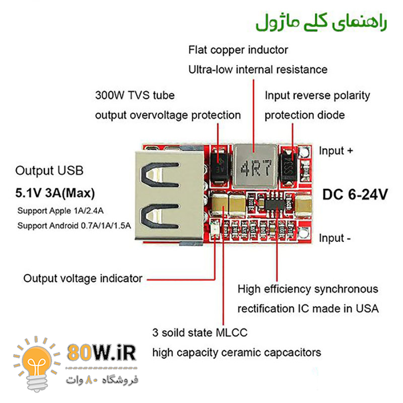 ماژول رگولاتور DC به DC کاهنده ورودی 6V تا 24V خروجی 5V 3A USB یک دستگاه الکترونیکی کوچک است که میتواند ولتاژ ورودی DC را به ولتاژ خروجی DC 5V با جریان خروجی 3A تبدیل کند. این ماژول برای کاربردهای مختلفی مانند شارژ دستگاههای الکترونیکی، تامین برق تجهیزات الکترونیکی و غیره مناسب است.