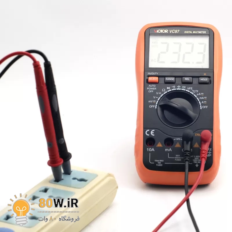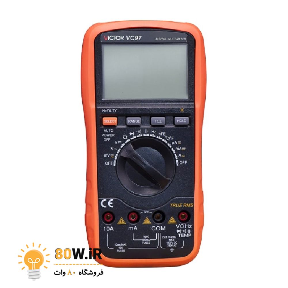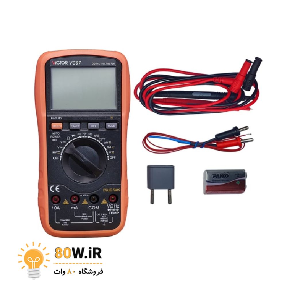 مولتی متر دیجیتالی VICTOR VC-97 با عملکردی بالا است که توسط یک باتری 9V کتابی کار می کند، مولتی متر VC-97 با استفاده از یک نمایشگر با ارتفاع 42 میلی متر و نور پس زمینه راحتی کار را برای کاربر فراهم کرده است ،این مولتی متر عملکرد اندازه گیری DCV ، ACV ، DCA ، ACA ، مقاومت و ظرفیت ، فرکانس ، دما ، ترانزیستور ، آزمایش دیود و پیوستگی ، مولتی متر ویکتور VICTOR VC 97 دیجیتال یکی از کاربردی ترین و اصلی ترین تجهیزات دقیق تست و اندازه گیری جهت تعمیرات بردهای الکترونیک و قطعات ، تولید و راه اندازی در آموزشگاه ها، آزمایشگاه ها، صنایع، کارخانجات، کارگاه های تولیدی و تعمیرگاه های برق و الکترونیک جهت استفاده دانش آموزان و هنرجویان و مهندسین محسوب میشود .